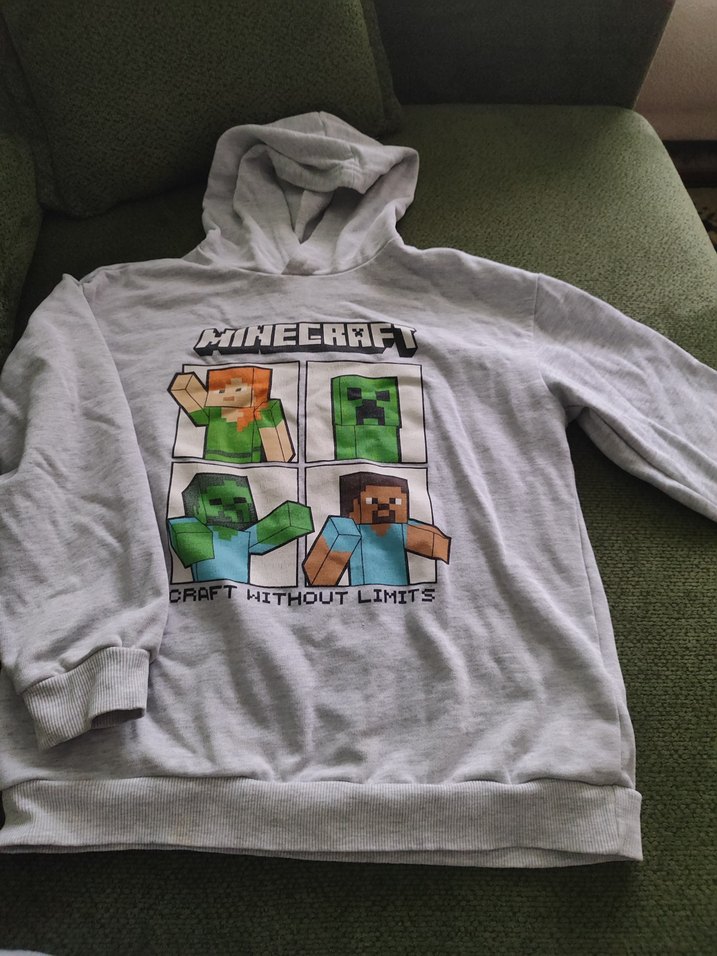 Gri renkli, uzun kollu, bisiklet yaka ve bol kesim erkek çocuk sweatshirtü. Yumuşak, örme dokulu kumaştan üretilmiş ve önünde Minecraft baskısı bulunur. (kırışık olduğundan dolayı yıpranmış gibi gözükebilir ama aslında oyl değil çok giyilmedi)