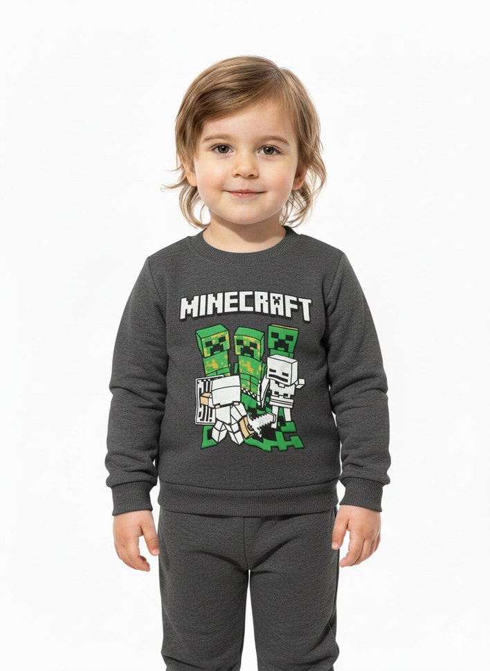 Gri renkli, örme yumuşak kumaştan, bol kesim ve bisiklet yaka erkek çocuk eşofman takımı. Önü Minecraft baskılı, rahat ve trend görünümlü. ️