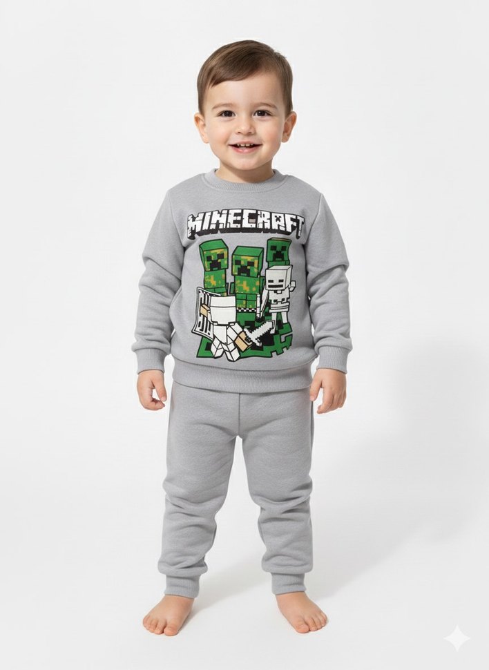 Gri renk, bol kesim, crew neck, pamuksu yumuşak kumaştan çocuk eşofman takımı. Minecraft baskılı, örme dokulu rahat ve şık.