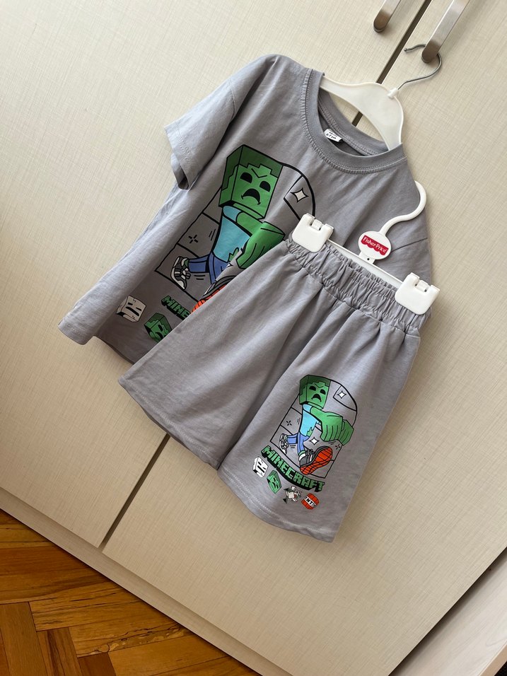 Gri renkte, Minecraft baskılı kısa kollu tişört ve şort takım. Yumuşak kumaştan üretilmiştir, çocuklar için rahat kullanım sağlar.