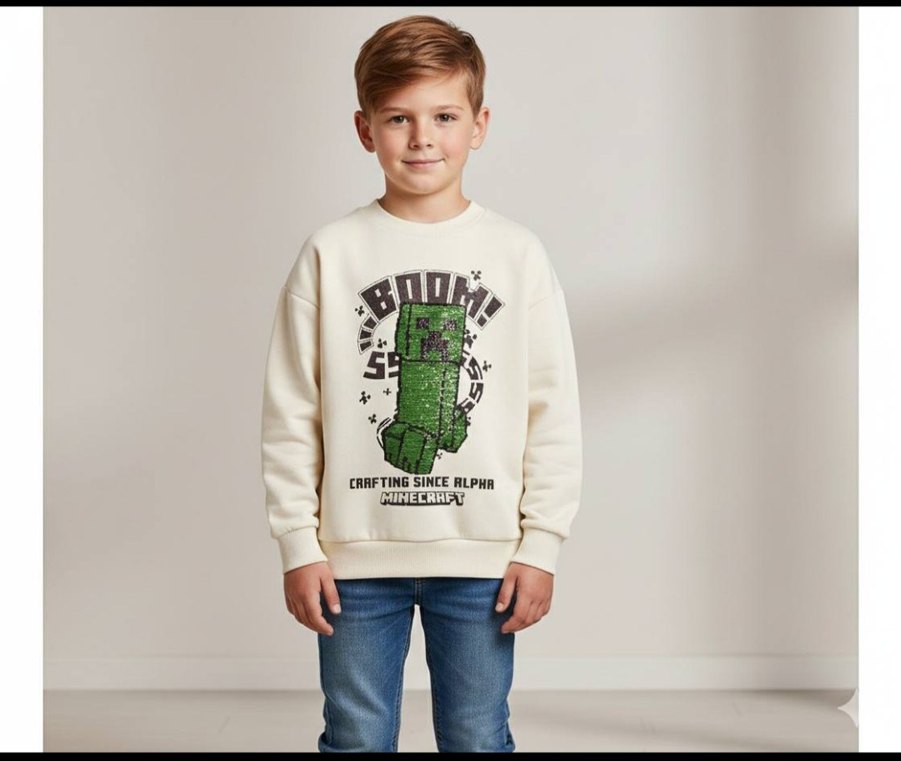 Yumuşak ve sıcak kumaştan, bol kesim, yuvarlak yakalı krem rengi sweatshirt. Minecraft baskılı ve örme detaylıdır. Beden 5-13 yaş arası *LÜTFEN İLANI SATIN ALMAYIN. YENİ İLAN AÇTIRIN.