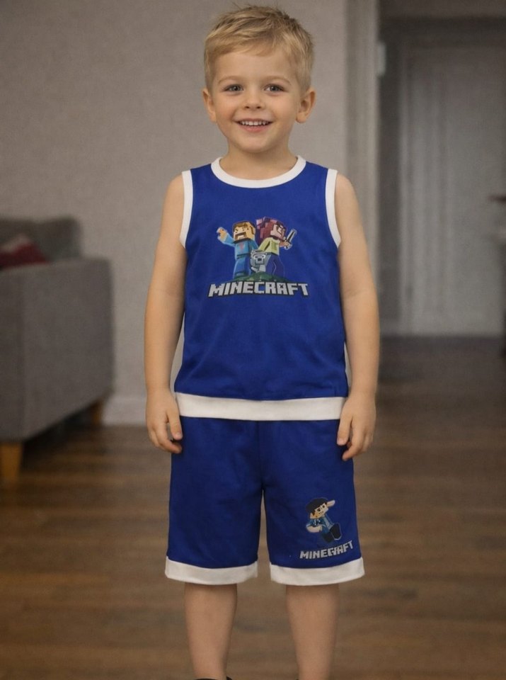 Rahat kesim, yumuşak kumaştan yapılmış, crew neck ve cırt cırt detaylı mavi renkli Minecraft baskılı erkek çocuk şort takımı.
