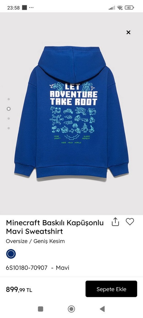 Koyu mavi renkli, geniş kesim ve uzun kollu çocuk sweatshirtü. Kapüşonlu ve sırtında Minecraft baskısı var. Örme yumuşak ve sıcak kumaştan üretilmiştir.