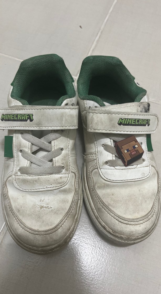 Minecraft baskılı, tokalı beyaz erkek çocuk spor ayakkabısı. Sokak stili ve kauçuk tabanlı, gri detaylar içerir. Temizlenip yollanacaktır