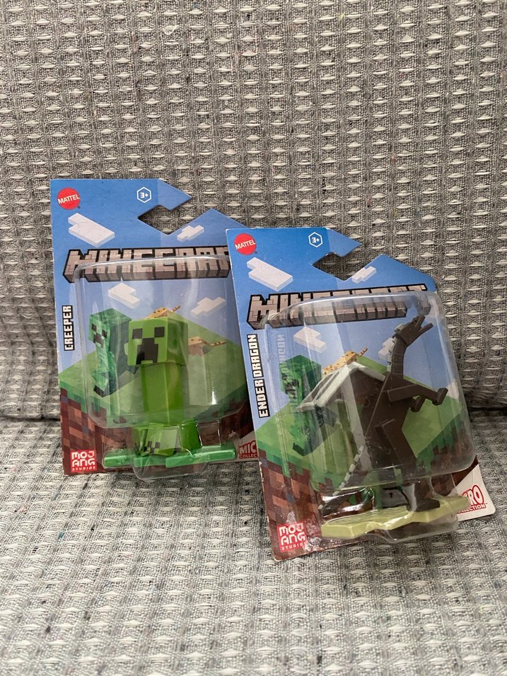 Minecraft oyunundan koyu yeşil Creeper ve Ender Dragon figürleri, orijinal ambalajlarında, piksel tarzı detaylarıyla birlikte. Kutu hiç açılmamıştır.