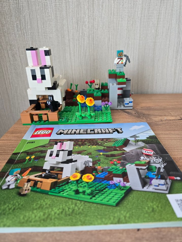 Minecraft temalı Lego seti, beyaz tavşan, çiçekler ve oyun karakterleriyle küçük bir manzara içerir. Oyun ve yapı keyfi sunar. Bir karakteri eksik
