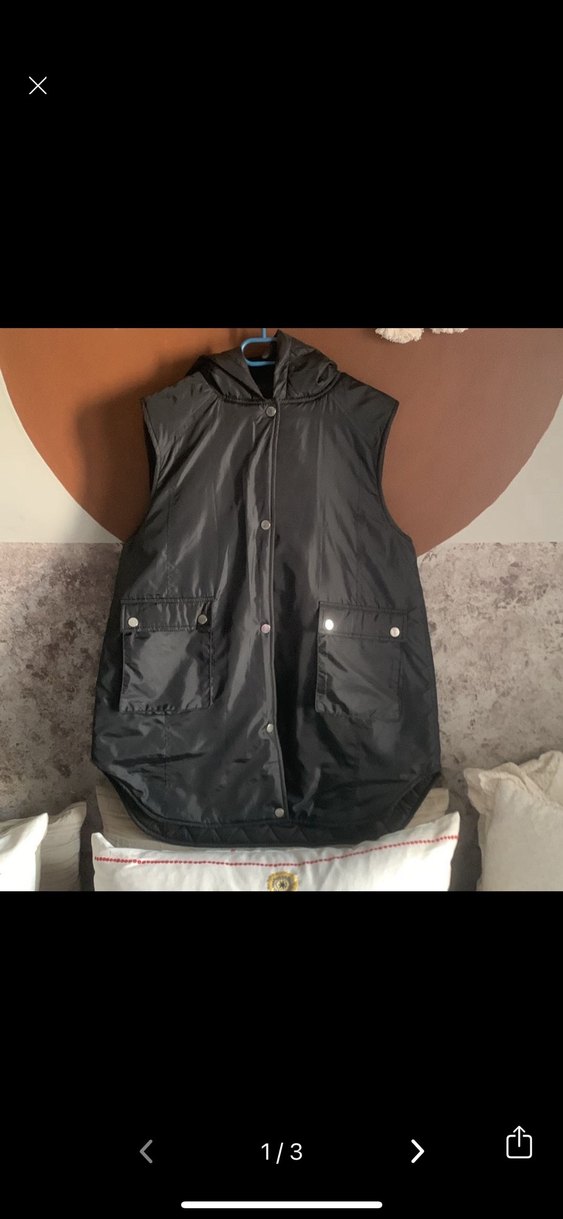 Siyah, düğmeli, yakalı, midi boy, koloksuz kadın yelek. Sentetik kumaştan, bol kesim, gündelik ve sokak stiline uygun. İki ön cepli, kullanışlı