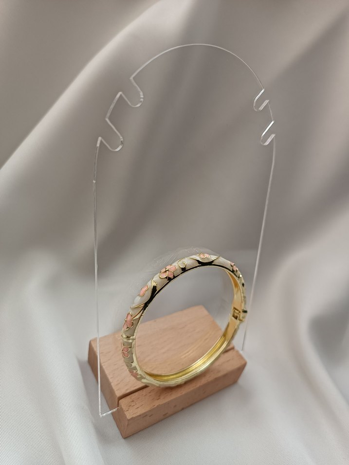 Krem üzerine pembe çiçekler ve taşlarla hoş bir tasarıma sahiptir.