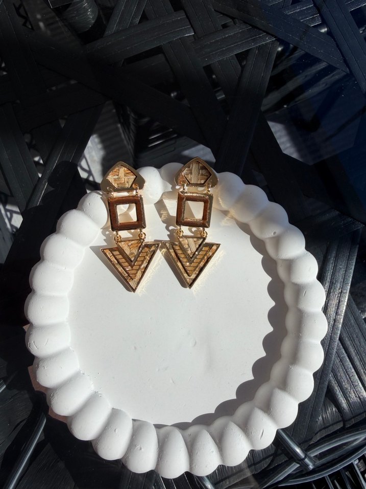 Mini uzunlukta, boncuk detaylı altın küpeler. Nakış desenli, bohem tarzda ve düğünler için uygun.