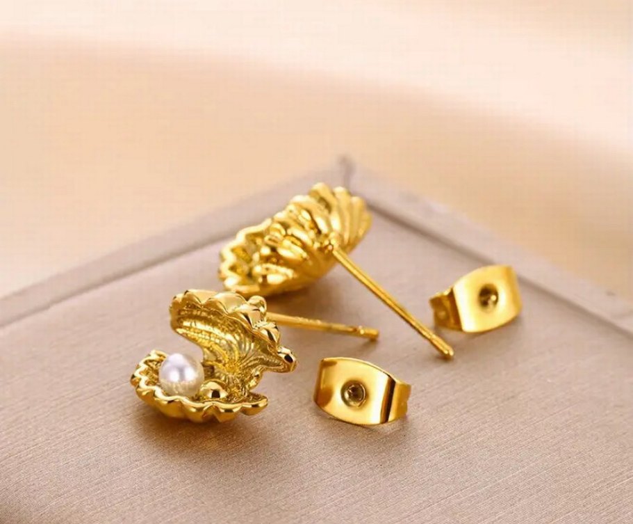 Kısa uzunlukta, kabuk şeklinde altın renkli, boncuk detaylı ve içinde küçük incili küpeler. Düğünler için uygun. ✨