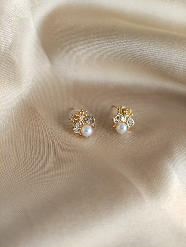 Mini altın renkli çiçek deseni ve inci detaylı boncuklu küpeler, düğünler için uygundur. Modern klasik tarzda, pastel tonlarda şık bir tasarım sunar.