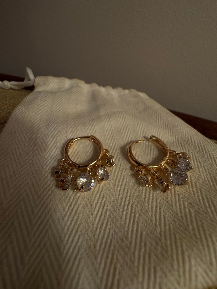 Mini uzunlukta, altın renkli ve taş işlemeli küpeler, parlak detaylarıyla düğün ve sokak stiline uygun bir şıklık sunar. ✨ Yurtdışında bir takıcıdan satın alındı.