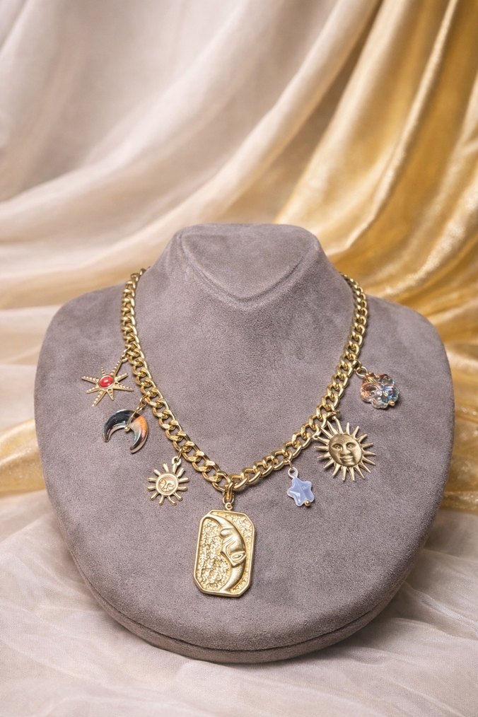 Parlak altın renkte kısa zincir detaylı, nakışlı bohem figürlü günlük kullanıma uygun kolye.