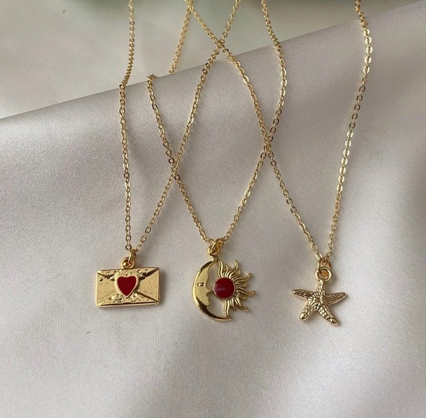 Detaylı zincirli, mini uzunlukta üçlü altın kolye seti; kalp zarf, güneş ve ay ile denizyıldızı figürlü bohem tasarım. ✨