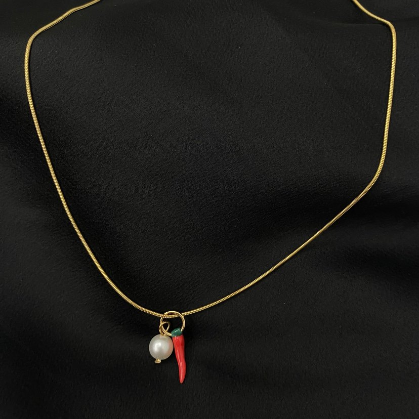 Kısa altın zincirli kolye, inci ve kırmızı biber figürlü detaylarıyla günlük kullanıma uygun cesur ve minimalist tarzda.