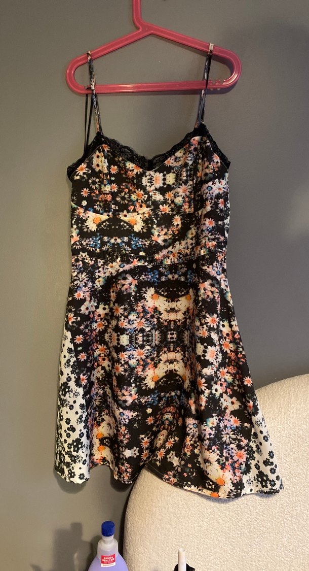 Bu oturan midi elbise, ince askılı ve dantel detaylıdır. Sentetik kumaştan yapılmış, koyu çok renkli bohem desenlere sahiptir, romantik buluşmalar için uygundur.
