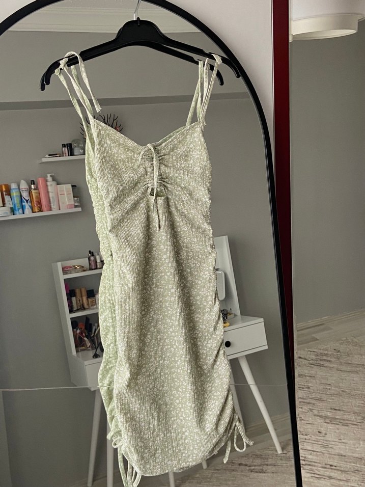 Açık yeşil çiçekli boyundan bağlamalı mini elbise