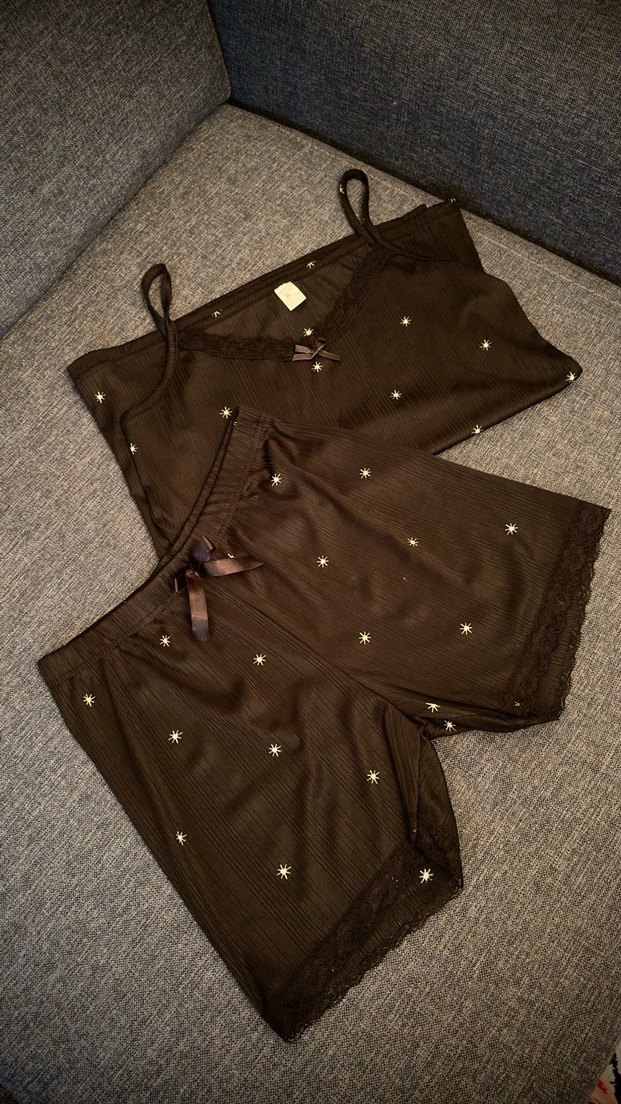kısa askılı ve fitted kesim mini pijama takımı, küçük yıldız desenleriyle gotik ve rahat bir stil sunar. ✨