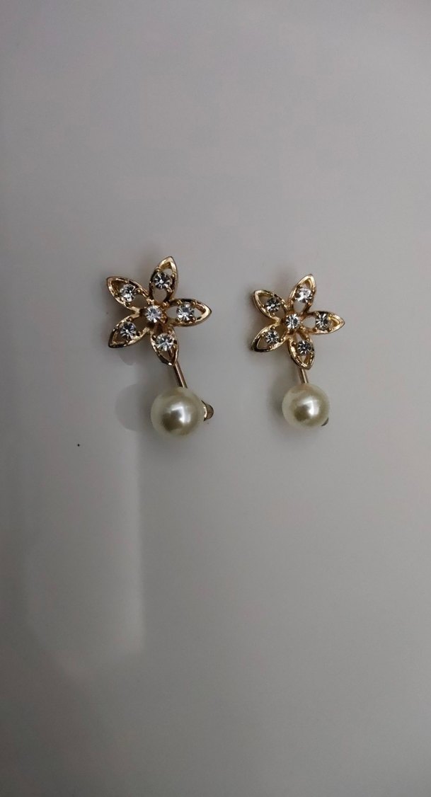 Parlak bej renkli, çiçek desenli ve incili mini küpeler, düğünler için klasik şıklık sunar.