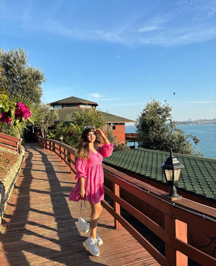Açık pembe, bol kesim, askısız ve katlı detaylara sahip mini elbise