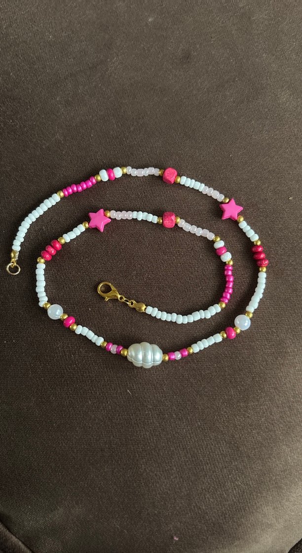 Mini uzunlukta, pastel tonlarda tie-dye desenli boncuklardan oluşan bohem tarzda kolye. Pembe yıldız boncuklar ve altın renkli toka bulunur.