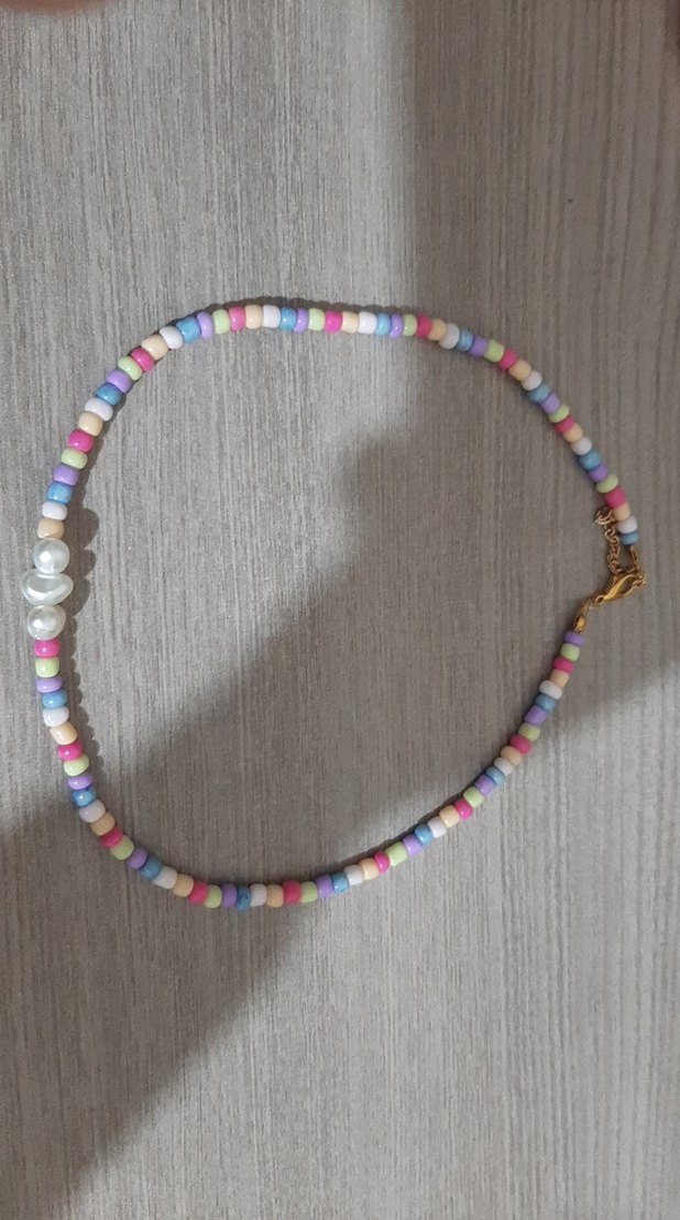 Mini uzunlukta, pastel renkli boncuklardan oluşan ve tie-dye desenli bohem tarzda kolye. İnci görünümlü birkaç boncuk içerir, günlük kullanım için uygundur.