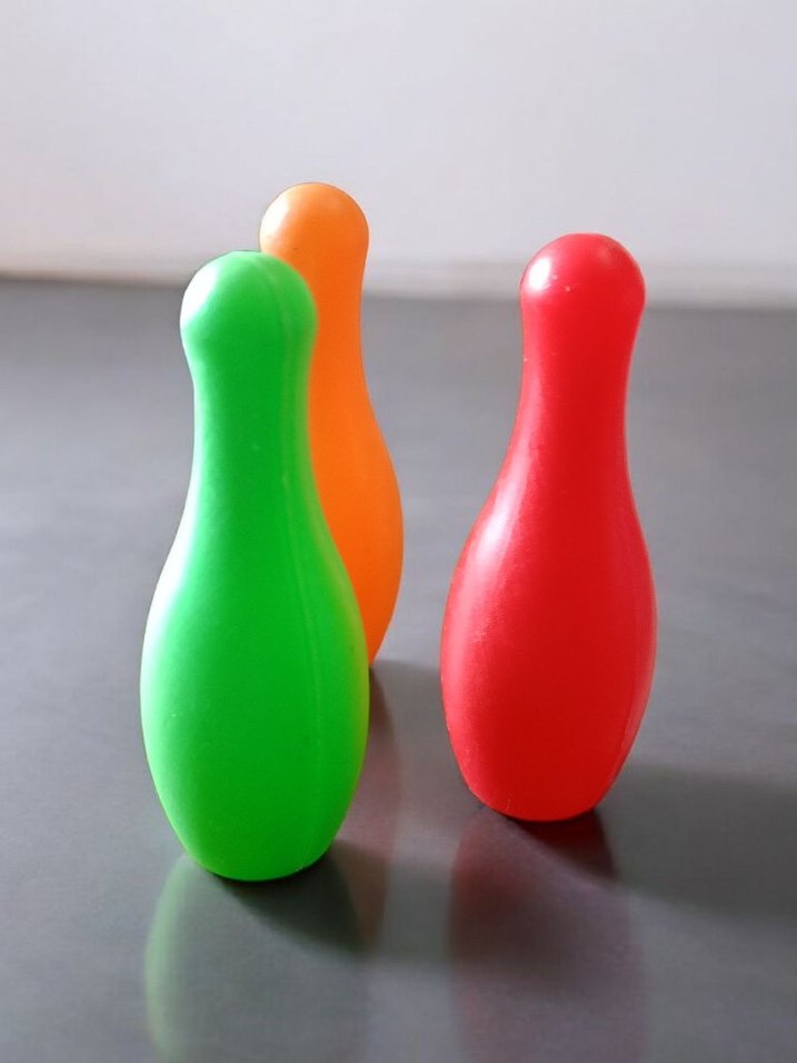 Yeşil, turuncu ve kırmızı renklerde, yumuşak ve pürüzsüz malzemeden yapılmış mini bowling labutları.