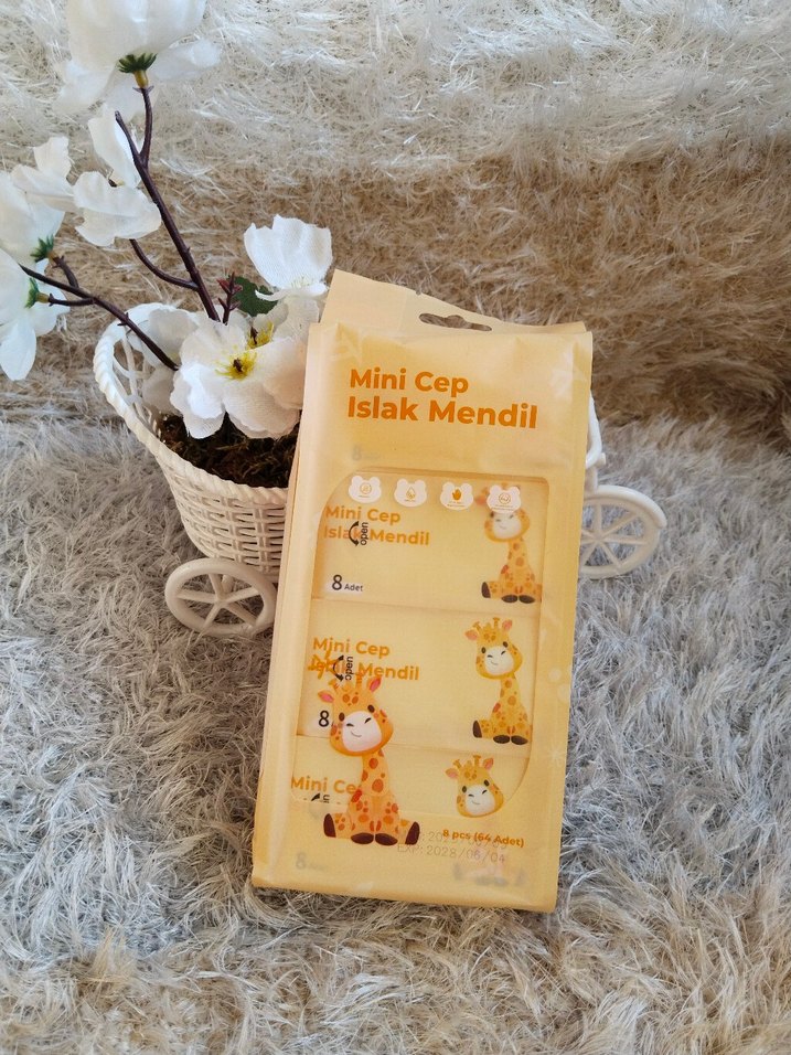Camel renginde, mini cep boy 8'li ıslak mendil paketi, sevimli zürafa desenlidir. Pratik ve hijyenik temizlik sağlar.