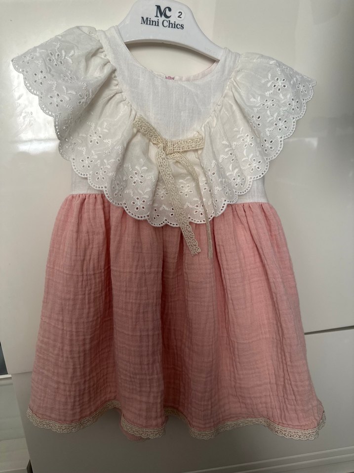 Mini Chics marka, pamuklu, pastel pembe, fırfırlı ve nakışlı, kısa kollu, straplez yaka, bol kesim kız çocuk elbisesi.