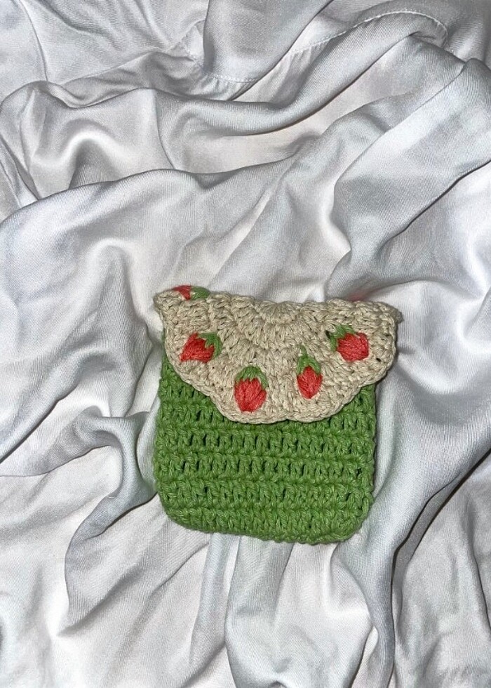 Cotton iple örülmüş mini çilek detaylı cüzdan
