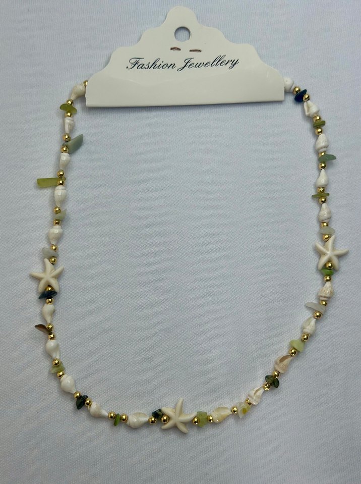 Mini uzunlukta, çok renkli boncuklar ve yıldız detaylarıyla işlenmiş bohem tarzda kolye, plaj için uygun.
