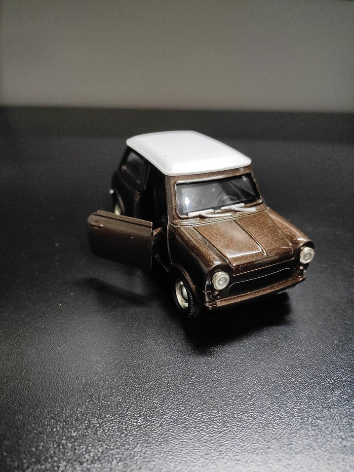 Koyu kahverengi oyuncak araba beyaz tavan ve açılan kapı detayına sahip. kaliteli iki üç kez kullanılmış sorunsuz