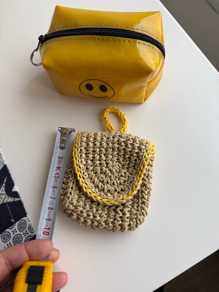 Sarı renkte, üzerinde gülen yüz baskısı olan bozuk para ve kartlık.yine sarı kenarlı örme küçük cepli bozuk para yada kartlık.