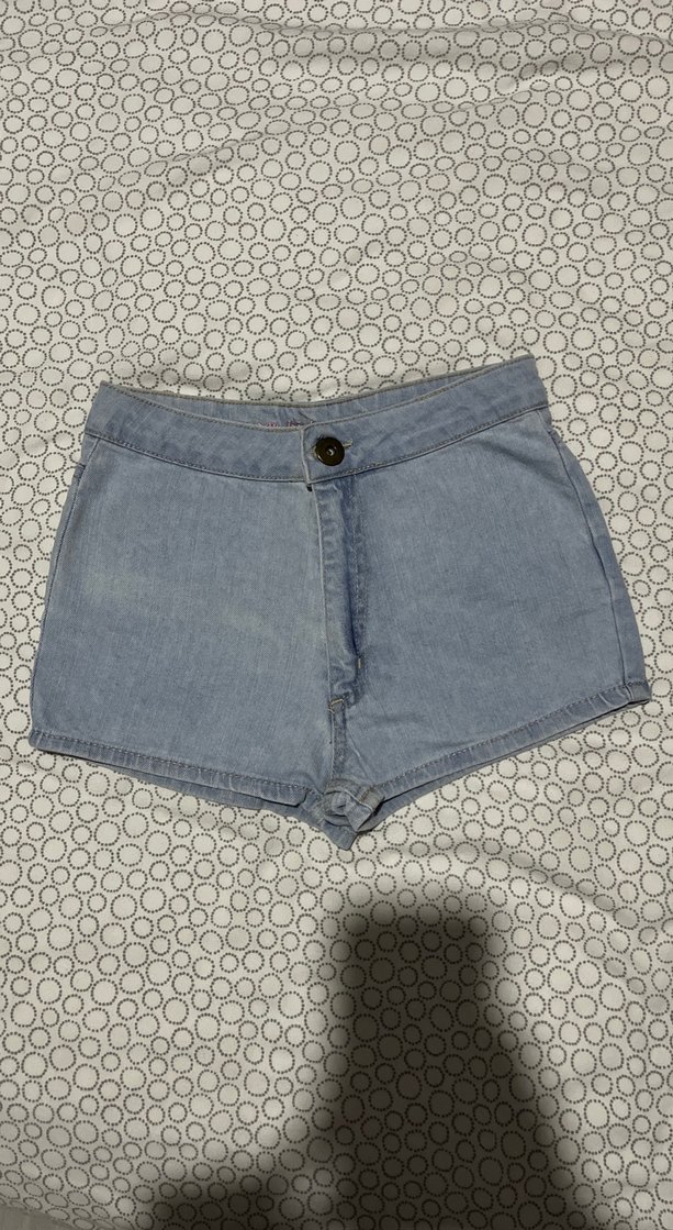 Mavi tonlarında dar kesim mini denim şort, günlük sokak stiline uygun.
