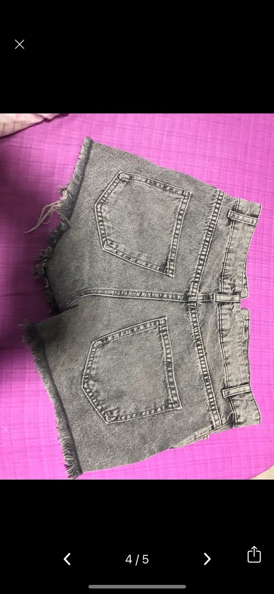 Gri renkli, düğmeli, kısa kesim, tie-dye desenli, fitted kesim kot şort. Sokak stili için uygun, kenarları püsküllü.