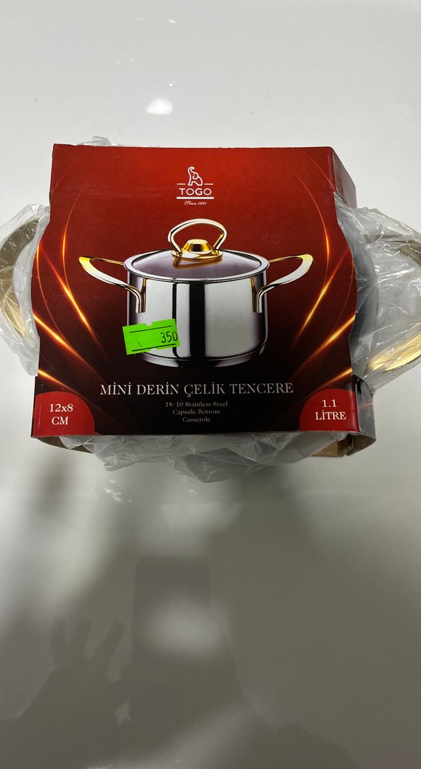 12x8 cm ölçülerinde, 1.1 litre kapasiteli mini derin çelik tencere, parlak altın renkli saplı Tencerenin kendi kulpu ve kapağını kulpu gold detaylıdır sıfır üründür TOGO markalı Aldığım fiyata satıyorum evde aynısı var kendim de kullanıyorum memnunum