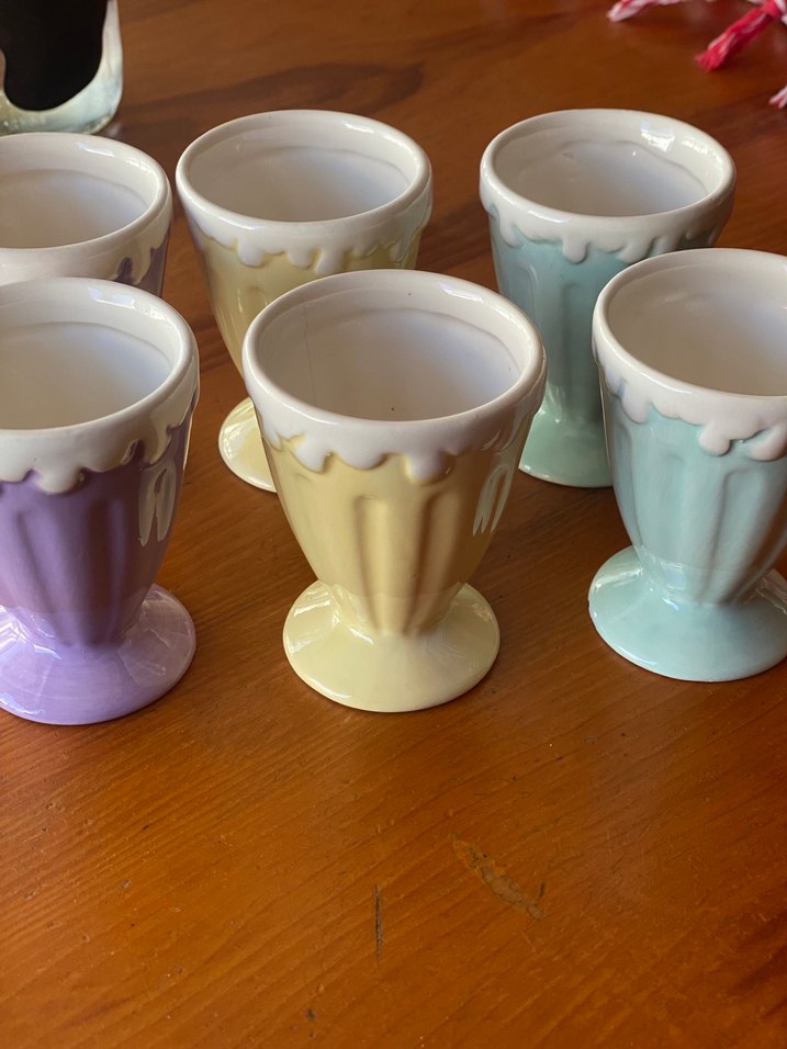 Seramik. Hiç kullanılmadı Pastel renklerde, kenarında damla desenli seramik mini bardaklar. Pürüzsüz yüzeyli ve sağlam tabanlı, küçük içecek veya tatlılar için uygun.