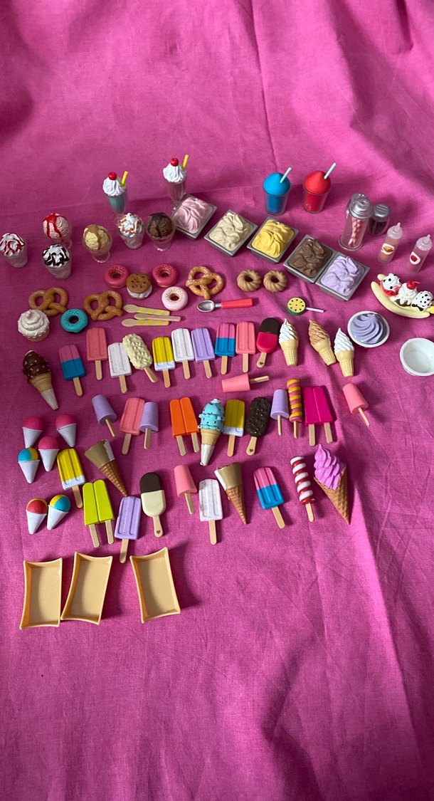 Canlı pastel renklerde çeşitli mini dondurma ve tatlı oyuncaklarından oluşan pembe renkli set. Çok daha fazlası var elimde ilgilenirseniz resimlerim iade yok bilginize
