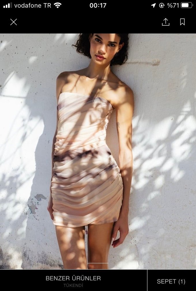 Zara xs beden etiketli. Straplez, drapeli detaylara sahip, bej ve gri tonlarında batik desenli mini elbise. Sıkı kesim ve kolsuz, çağdaş parti tarzı için uygun.