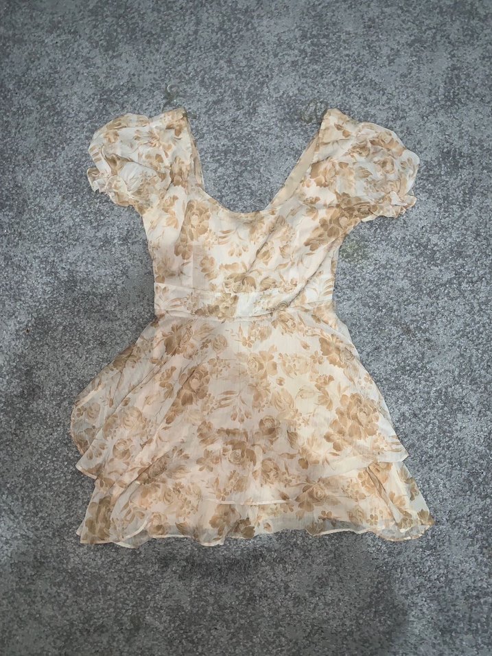 Bej renkte, V yaka ve kısa balon kollu, fırfır detaylı, vintage tie-dye desenli, %100 POLYESTER mini elbise.