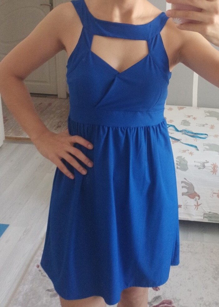 Ufak nokta bir yırtılma var belli olmuyor saks mavisi elbise L beden ile de uyumlu