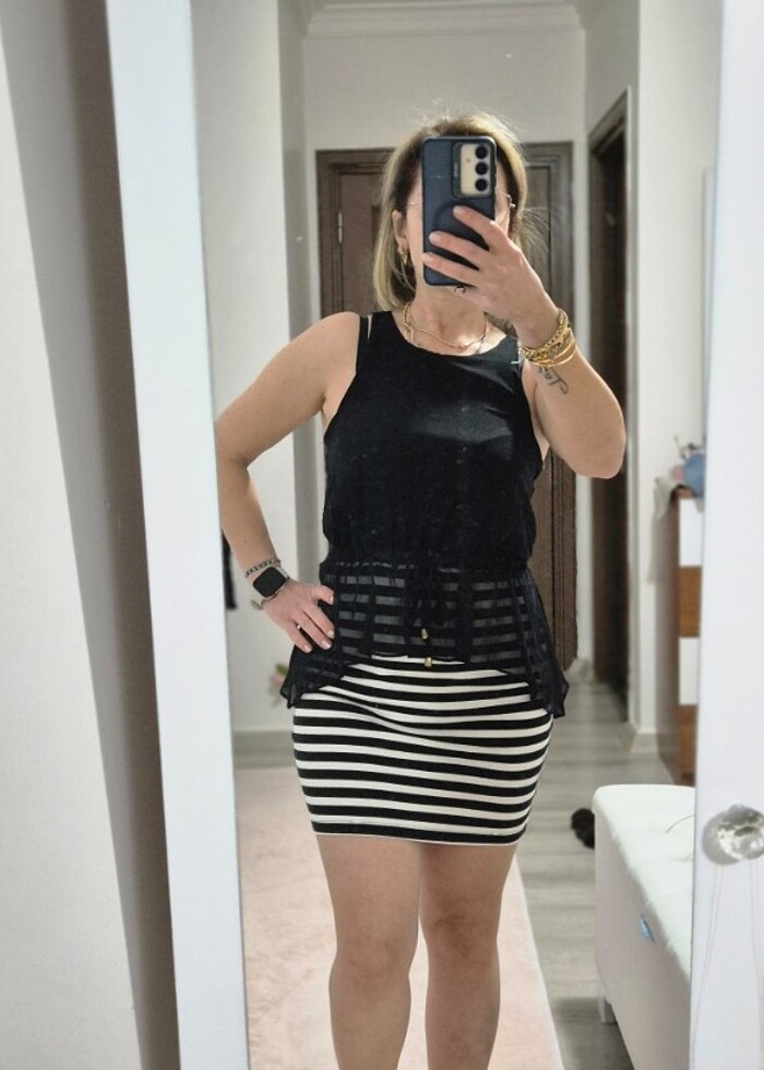Hem gece ister günlük olarak kombinlenebilir alt etek kısmı likralı penye formunda çok rahat etek ucu az sökülmüş ama giyilmeye engel değildir 1.56boy 55 kg m bedenim bende duruşu boyle