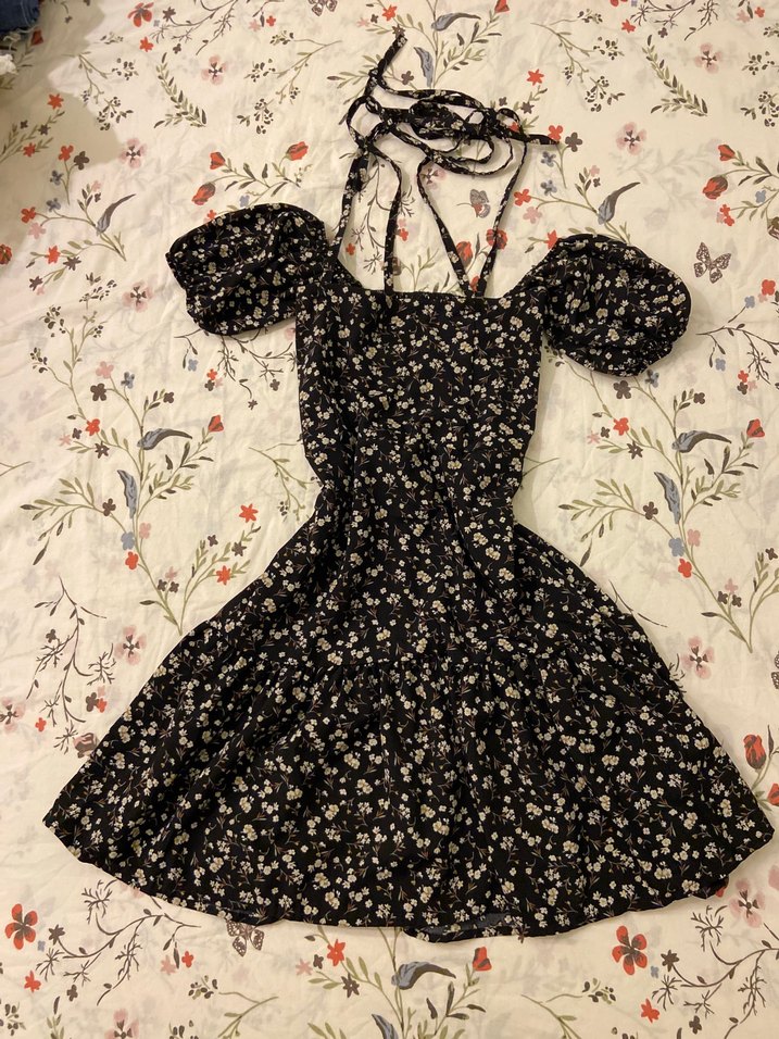 Siyah, çiçekli baskılı, bohem tarzı midi elbise. Şişme kısa kollar ve fırfır detaylı, vücuda oturan kesim. Giyildiğinde daha da güzel duruyor.
