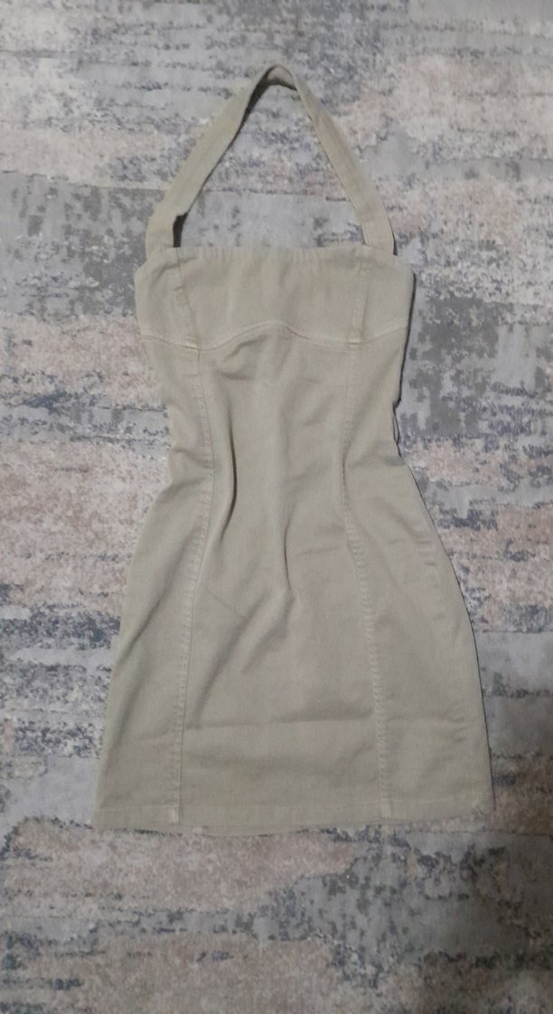 Bej keten mini elbise, straplez yakalı ve vücuda oturan kesimiyle günlük kullanım için rahat ve şık