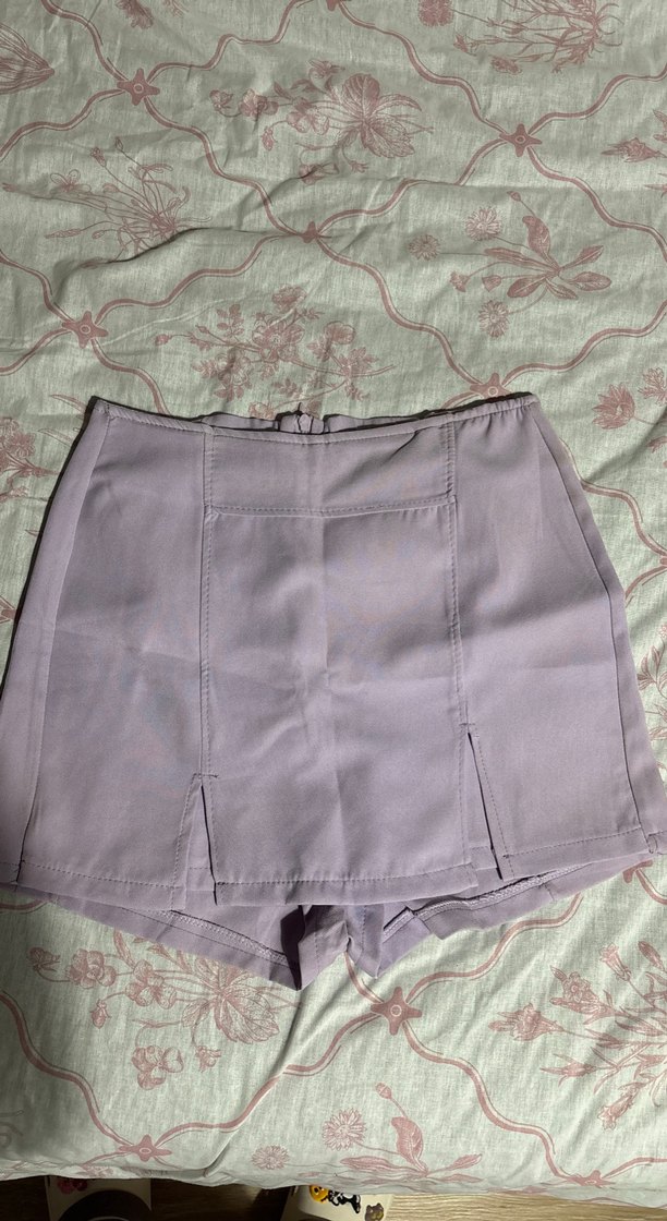 ön kısmı ve yumuşak sentetik kumaşıyla mor renkli, vücuda oturan mini etek, günlük sokak stili için uygundur.