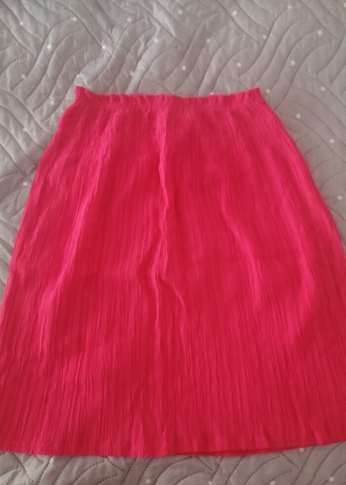Sadece bir kere giydim. Hiç bir sorunu yoktur. En son fotoda tam rengi belli, cırtlak fuşya değil tok bir rengi var ışıktan dolayı baya açık duruyor. Marka temsilidir. Kumaşı ütü istemez kendisinden pileli, krinkıl kumaştır. Beli lastikli olduğu için her bedene uyum sağlar S bedenlerde rahatça kullanabilir