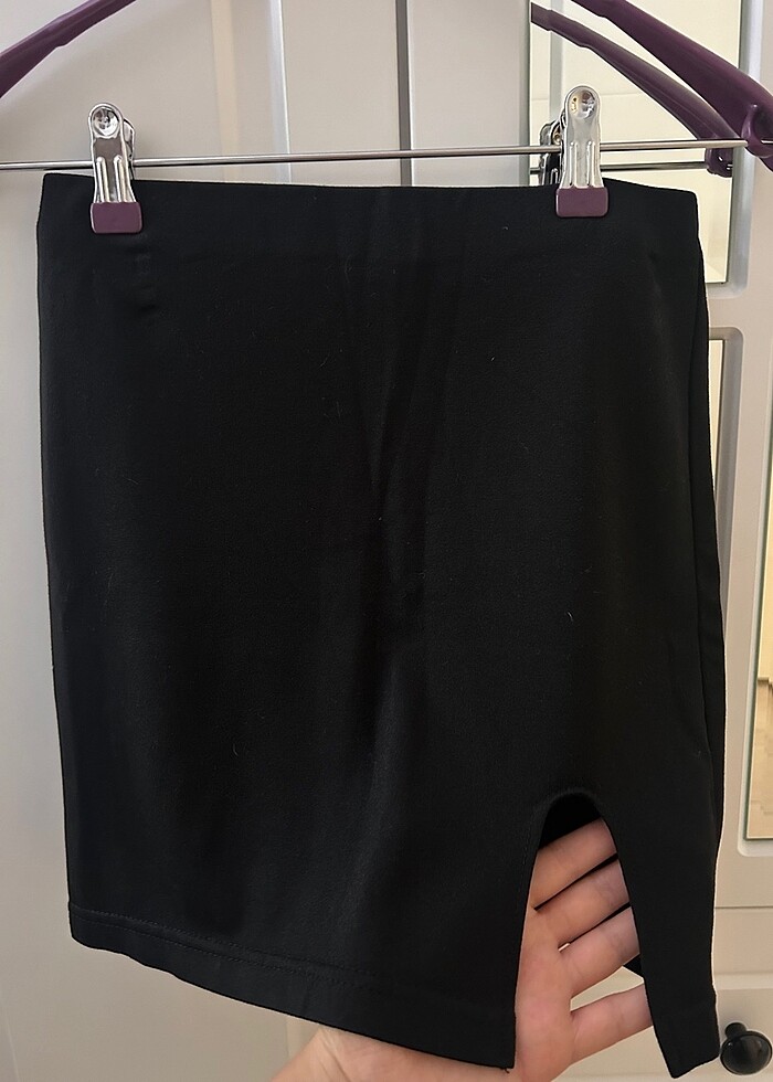 Önden pencere detaylı yırtmacı olan mini etek. Standart bedene uygundur. Hiç giyilmedi