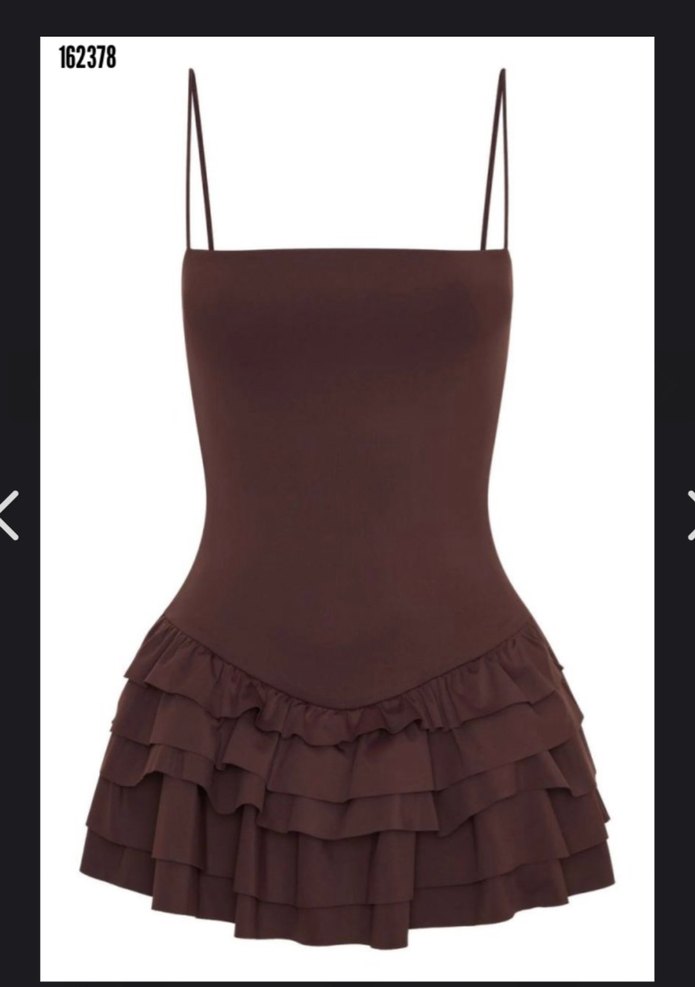 Siyah, straplez yakalı ve fırfırlı detaylara sahip, gövdeyi saran midi elbise. İnce askıları ve gotik tarzı ile parti için uygun.