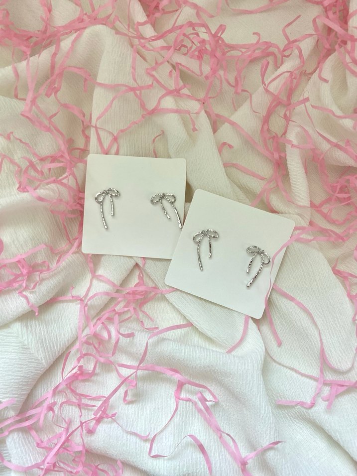 Mini kısa uzunlukta, işlemeli fiyonk detaylı pastel pembe kadın küpeleri. Bohem Paris tarzında, düğün için uygun sade tasarım.