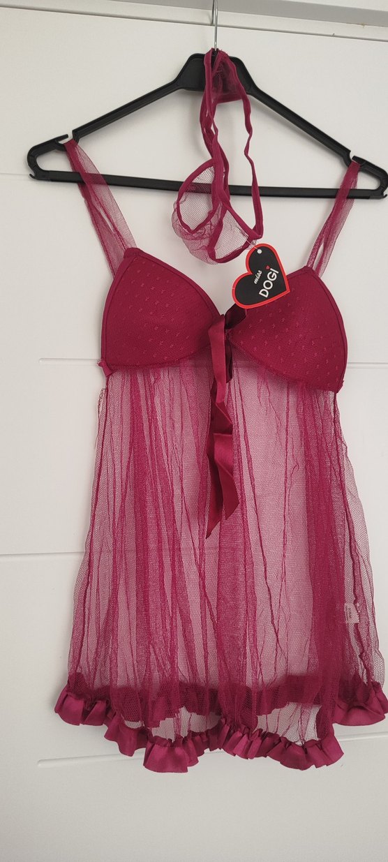 Koyu pembe renkte, ince askılı transparan tül kumaştan yapılmış, goth tarzı gecelik